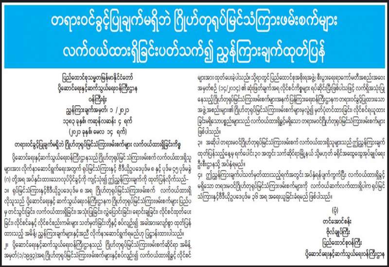 ကုန်သွယ်မှုမြှင့်တင်ရေးဆိုင်ရာကိစ္စရပ်များ၊ စားသုံးသူကာကွယ်ရေးဆိုင်ရာ ကိစ္စရပ်များ၊ မူပိုင်ခွင့်ဥပဒေဆိုင်ရာ အကောင်အထည်ဖော် ဆောင်ရွက်ရမည့်ကိစ္စရပ်များ၊ ပြည်တွင်း ကုန်စည် စီးဆင်းမှု အခြေအနေများနှင့်ပတ်သက်၍ အပတ်စဉ်ကျင်းပသည့် ဝန်ကြီးဌာနတွင်း လုပ်ငန်း ညှိနှိုင်းအစည်းအဝေးကို ယနေ့နံနက် ၁၀ နာရီတွင် စီးပွားရေးနှင့် ကူးသန်းရောင်းဝယ်ရေး ဝန်ကြီးဌာန၊ ဝန်ကြီးရုံး အစည်းအဝေးခန်းမ (၁) ၌ ကျင်းပရာ စီးပွားရေးနှင့် ကူးသန်း ရောင်းဝယ်ရေးဝန်ကြီးဌာန ပြည်ထောင်စုဝန်ကြီးဒေါက်တာပွင့်ဆန်း တက်ရောက်အမှာစကား ပြောကြားသည်။