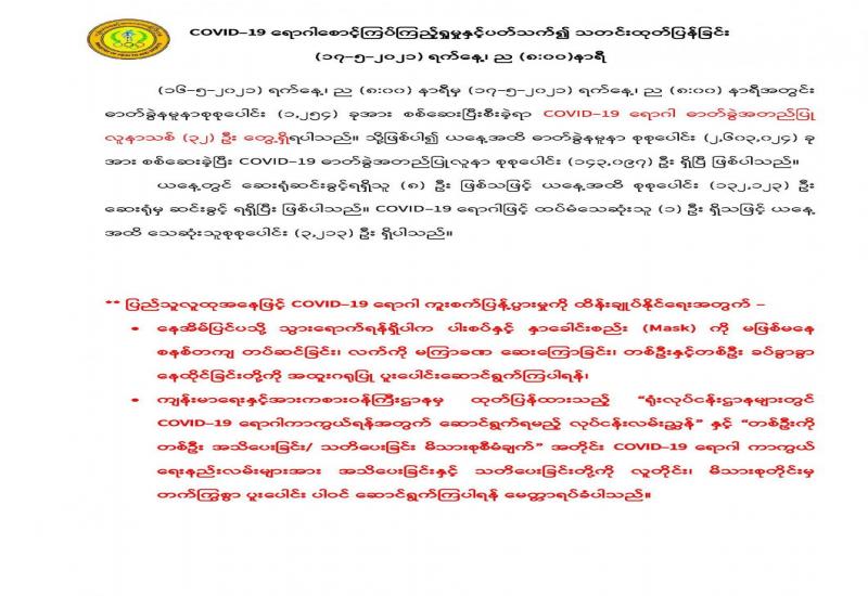 လူမှုဝန်ထမ်းဦးစီးဌာနတွင် ကိုဗစ်-၁၉ ကြောင့် ခေတ္တရပ်ဆိုင်းခဲ့ရသည့် လုပ်ငန်းများ အကောင် အထည်ဖော်နိုင်ရေးနှင့်ပတ်သက်၍ ရှင်းလင်းတင်ပြခြင်းအစည်းအဝေးကို ယနေ့တွင် လူမှုဝန်ထမ်း၊ ကယ်ဆယ်ရေးနှင့် ပြန်လည်နေရာချထားရေးဝန်ကြီးဌာန ဝန်ကြီးရုံး အစည်းအဝေးခန်းမ၌ ကျင်းပ သည်။