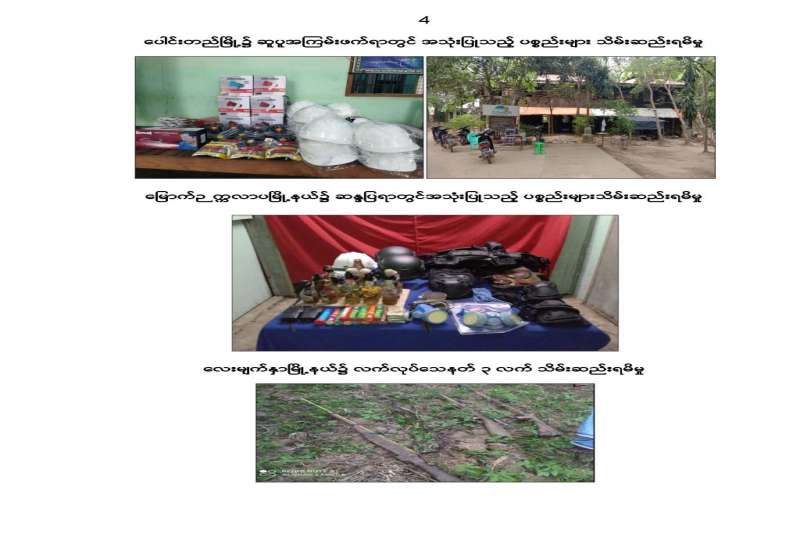လုံခြုံရေးတပ်ဖွဲ့ဝင်များသည် ဆူပူအကြမ်းဖက်မှုလုပ်ရပ်များတွင် အသုံးပြုမည့် လက်နက်၊ ပစ္စည်း၊ ကိရိယာများ ဆက်လက်ဖော်ထုတ်သိမ်းဆည်းရမိခဲ့ကြောင်း သိရသည်။