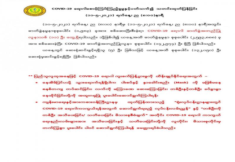 တပ်မတော်အနေဖြင့် တိုင်းစစ်ဌာနချုပ်နယ်မြေအသီးသီးရှိ ထေရ်ကြီးဝါကြီး ဆရာတော်ကြီးများ အပါအဝင် လူမျိုးမရွေး၊ ဘာသာမရွေး အသက်(၆၅)နှစ်အထက် သက်ကြီးဘိုးဘွားများ၊ ဌာနဆိုင်ရာဝန်ထမ်း များနှင့် တိုင်းရင်းသားပြည်သူများအား ကိုဗစ်-၁၉ ရောဂါ ကာကွယ် ဆေးထိုးနှံနိုင်ရေးအတွက် ဆေးပစ္စည်းများကို တပ်မတော် လေယာဉ်များဖြင့် သယ်ယူပို့ဆောင် ပေးခြင်းများနှင့် ကာကွယ်ဆေးထိုးနှံပေးခြင်းများ ဆောင်ရွက်ပေးလျက်ရှိသည်။