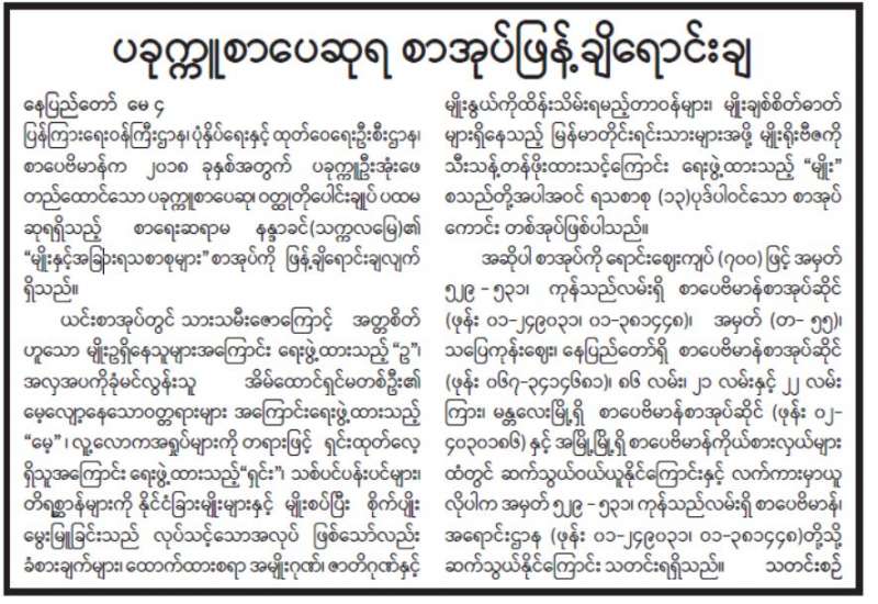 ပညာရေးဝန်ကြီးဌာန အဆင့်မြင့်ပညာကဏ္ဍ (ဝိဇ္ဇာ သိပ္ပံတက္ကသိုလ်များ၊ ပညာရေးဒီဂရီ ကောလိပ်များ) ဘဏ္ဍာရေးဆိုင်ရာစီမံ ခန့်ခွဲကြီးကြပ်မှုမွမ်းမံသင်တန်းကို ယနေ့နံနက် ၉ နာရီတွင် နေပြည်တော်ရှိ ပညာရေးဝန်ကြီးဌာန ရုံးအမှတ်(၁၃) အစည်းအဝေး ခန်းမ၌ကျင်းပသည်။