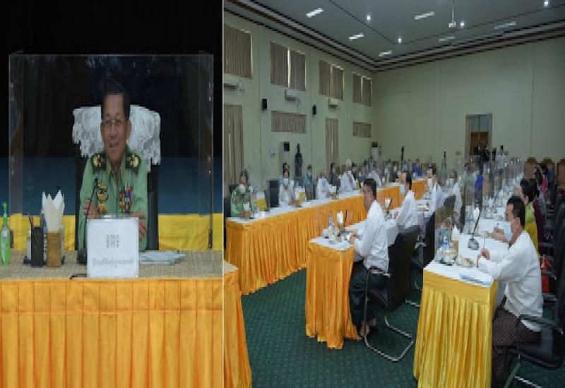 နိုင်ငံတော်စီမံအုပ်ချုပ်ရေးကောင်စီ အစည်းအဝေး (၉/၂၀၂၁)ကို ယနေ့မွန်းလွဲပိုင်း တွင် နေပြည်တော်ရှိ နိုင်ငံတော်စီမံအုပ်ချုပ်ရေးကောင်စီဥက္ကဋ္ဌရုံး အစည်းအဝေးခန်းမ၌ ကျင်းပရာ နိုင်ငံတော်စီမံအုပ်ချုပ်ရေးကောင်စီဥက္ကဋ္ဌ၊ တပ်မတော်ကာကွယ်ရေးဦးစီးချုပ် ဗိုလ်ချုပ်မှူးကြီး မင်းအောင်လှိုင် တက်ရောက်အမှာစကားပြောကြားသည်။