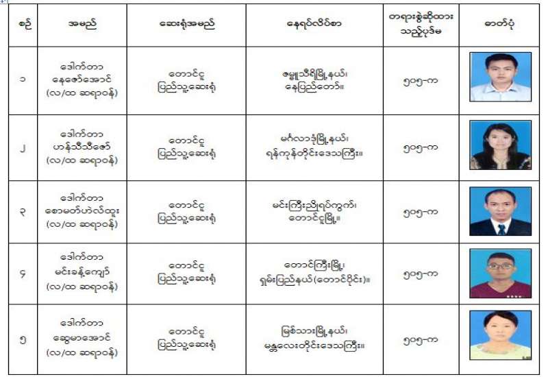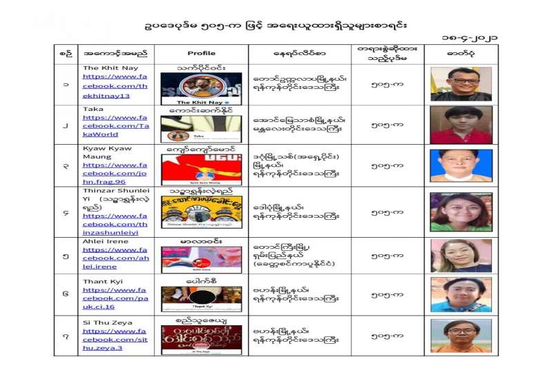 နိုင်ငံတော်၏ အုပ်ချုပ်မှုယန္တရားပျက်ပြားစေရန်ရည်ရွက်ချက်ဖြင့် နိုင်ငံ့ဝန်ထမ်းများအား CDM လှုပ်ရှားမှုတွင် ပါဝင်စေရန်လှုံ့ဆော်ခြင်း၊ CRPH မတရားအသင်းအား ထောက်ခံသည့် အကြောင်းအရာများ၊ မမှန်သတင်းများ အားဖြန့်ဝေခြင်း၊ နိုင်ငံတော်တည်ငြိမ်အေးချမ်းမှုကို ပျက်ပြားစေပြီး ဆူပူအုံကြွမှုဖြစ်ပေါ်စေရန်နှင့် အများပြည်သူ အထိတ်တလန့်ဖြစ်စေရန် အတွက် သွေးထိုးလှုံ့ဆော်မှုများပြုလုပ်ခြင်း၊ Social Pumishment ပြုလုပ်ခြင်းများကို လူမှုကွန်ရက် စာမျက်နှာများတွင် ရည်ရွယ်ချက်ရှိရှိ ဖြင့်ဖော်ပြခြင်းနှင့် ဖြန့်ဝေခြင်းများ ဆောင်ရွက် လျက်ရှိသည့် အောက်ဖော်ပြပါ အနုပညာရှင်အချို့နှင့် အခြားပါဝင်ပတ်သက်သူများအား ရာဇသတ်ကြီးပုဒ်မ ၅၀၅-က ဖြင့် အမှုဖွင့်အရေးယူ ဆောင်ရွက်လျက်ရှိပါသည်။
