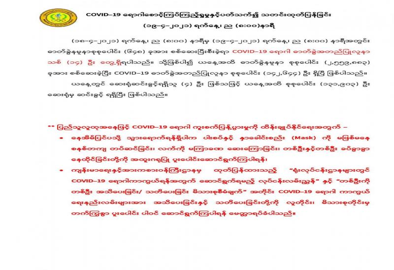 ဆက်လက်ထိန်းသိမ်းကာကွယ် မြန်မာနိုင်ငံတွင် အသက်ရှူလမ်းကြောင်းဆိုင်ရာ ကိုဗစ်-၁၉ ကူးစက် ရောဂါမဖြစ်ပွားအောင် ကာကွယ်၊ ထိန်းချုပ်၊ ကုသပေးလျက်ရှိသည်။ ကိုဗစ်-၁၉ ကပ်ရောဂါသည် ၂၀၂၀ ပြည့်နှစ်တစ်နှစ်လုံး ကမ္ဘာတစ်ခွင် ကူးစက်ပြန့်ပွားခဲ့ပြီး ၂၀၂၁ ခုနှစ်တွင်လည်း ပြီးဆုံးခြင်းမရှိသေးပေ။ ယခုအခါ ကမ္ဘာပေါ်ရှိနိုင်ငံများတွင် ကိုဗစ်-၁၉ တတိယလှိုင်း ဖြစ်ပေါ်လာပြီးတစ် ကမ္ဘာလုံး ဆိုင်ရာ ကိုဗစ်-၁၉ကူးစက်မှုနှုန်းအမြင့်ဆုံးအနေအထား သို့ နီးကပ်လာကြောင်း ကမ္ဘာ့ကျန်းမာရေး အဖွဲ့ကြီး က ဧပြီလ ၁၆ ရက်နေ့က အသိ ပေးထားသည်။