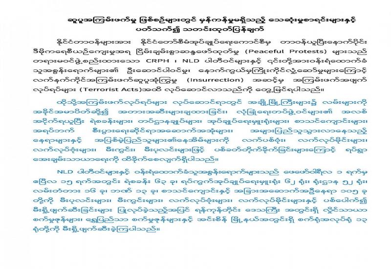 နိုင်ငံတော်အတွင်း ဆူပူအကြမ်းဖက်သူလူစုအုပ်စုများအနေဖြင့် လုံခြုံရေး တပ်ဖွဲ့ဝင် များ၏ အလစ်အငိုက်ကို အခွင့်ကောင်းယူကာ နိုင်ငံတော်ပိုင်အဆောက် အဦများ၊ အေးချမ်းစွာနေထိုင်လိုသော ပြည်သူလူထုအချို့၏ နေအိမ်များအား မီးပုလင်း ဖြင့်ပစ် ပေါက်ခြင်း၊ မီးရှို့ခြင်းများအပြင် အများပြည်သူ သွားလာလှုပ်ရှားနေသော လမ်းမ ကြီးများပေါ်တွင် လက်လုပ်ဗုံးများ ပစ်ဖောက်ခြင်း၊ ထောင်ထား ခြင်းများအား ပြုလုပ် နေကြသည်ကို တွေ့ရှိနေရပါသည်။
