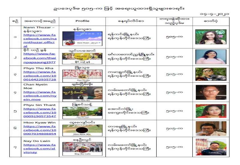 နိုင်ငံတော်၏ အုပ်ချုပ်မှုယန္တရားပျက်ပြားစေရန်ရည်ရွက်ချက်ဖြင့် နိုင်ငံ့ဝန်ထမ်းများအား CDM လှုပ်ရှား မှုတွင် ပါဝင်စေရန်လှုံ့ဆော်ခြင်း၊ CRPH မတရားအသင်းအား ထောက်ခံသည့် အကြောင်းအရာများ၊ မမှန်သတင်းများအားဖြန့်ဝေခြင်း၊ နိုင်ငံတော်တည်ငြိမ်အေးချမ်းမှုကို ပျက်ပြားစေပြီး ဆူပူအုံကြွမှု ဖြစ်ပေါ်စေရန်နှင့် အများပြည်သူအထိတ်တလန့်ဖြစ်စေရန် အတွက် သွေးထိုးလှုံ့ဆော်မှုများ ပြုလုပ်ခြင်း၊ Social Pumishment ပြုလုပ်ခြင်းများကို လူမှုကွန်ရက် စာမျက်နှာများတွင် ရည်ရွယ်ချက်ရှိရှိ ဖြင့်ဖော်ပြခြင်းနှင့် ဖြန့်ဝေခြင်းများ ဆောင်ရွက် လျက်ရှိသည့် အောက်ဖော်ပြပါ အနုပညာရှင်အချို့နှင့် အခြားပါဝင်ပတ်သက်သူများအား ရာဇသတ်ကြီးပုဒ်မ ၅၀၅-က ဖြင့် အမှုဖွင့်အရေးယူ ဆောင်ရွက် လျက်ရှိပါသည်။