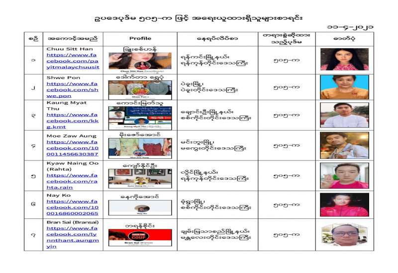နိုင်ငံတော်၏ အုပ်ချုပ်မှုယန္တရားပျက်ပြားစေရန်ရည်ရွက်ချက်ဖြင့် နိုင်ငံ့ဝန်ထမ်းများအား CDM လှုပ်ရှားမှုတွင် ပါဝင်စေရန်လှုံ့ဆော်ခြင်း၊ CRPH မတရားအသင်းအား ထောက်ခံသည့် အကြောင်းအရာများ၊ မမှန်သတင်းများအားဖြန့်ဝေခြင်း၊ နိုင်ငံတော်တည်ငြိမ်အေးချမ်းမှုကို ပျက်ပြားစေပြီး ဆူပူအုံကြွမှုဖြစ်ပေါ်စေရန်နှင့် အများပြည်သူအထိတ်တလန့်ဖြစ်စေရန် အတွက် သွေးထိုးလှုံ့ဆော်မှုများပြုလုပ်ခြင်း၊ Social Punishment ပြုလုပ်ခြင်းများကို လူမှုကွန်ရက် စာမျက်နှာများတွင် ရည်ရွယ်ချက်ရှိရှိ ဖြင့်ဖော်ပြခြင်းနှင့် ဖြန့်ဝေခြင်းများ ဆောင်ရွက် လျက်ရှိသည့် အောက်ဖော်ပြပါ အနုပညာရှင်အချို့နှင့် အခြားပါဝင်ပတ်သက်သူများအား ရာဇသတ်ကြီးပုဒ်မ ၅၀၅-က ဖြင့် အမှုဖွင့်အရေးယူ ဆောင်ရွက်လျက်ရှိပါသည်။