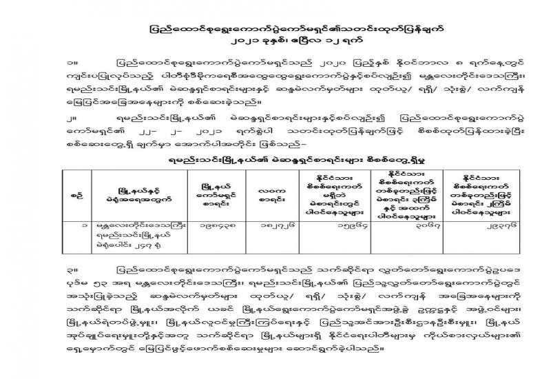 ၁၀။ ပြည်ထောင်စုရွေးကောက်ပွဲကော်မရှင် အဖွဲ့ဝင် ဦးခင်မောင်ဦးက ဆက်လက်ရှင်းလင်းရာ တွင် ၂၀၂၀ ပြည့်နှစ်အထွေထွေရွေးကောက်ပွဲတွင် သက်ဆိုင်ရာ မြို့နယ်ကော်မရှင်အဖွဲ့ခွဲများ အသုံး ပြုခဲ့သည့် နောက်ဆုံး မဲစာရင်း soft copy များကို ရယူပြီးနောက် ပြည်ထောင်စုရွေးကောက်ပွဲကော် မရှင်က စိစစ်ထုတ်ပြန်လျက်ရှိရာ ၂၀၂၁ ခုနှစ်၊ ဖေဖော်ဝါရီလ ၁၆ ရက်နေ့မှ ဧပြီလ ၈ ရက်နေ့အထိ ထုတ်ပြန်ပြီးစီးမှုများအရ တိုင်းဒေသကြီး/ပြည်နယ် နှင့် ပြည်ထောင်စုနယ်မြေ ၁၁ ခုရှိ မြို့နယ်ပေါင်း ၁၀၆ မြို့ နယ်၊ မဲရုံပေါင်း ၁၄၂၁၄ ရုံကို စိစစ်ခဲ့ရာ မြို့နယ်ကော်မရှင် စာရင်းအရ မဲဆန္ဒရှင် ၁၄၄၈၅၃၃၀ ဦးဖြစ်သော်လည်း လဝကစာရင်းအရ ၁၁၁၁၁၈၁၆ ဦးသာရှိပြီး ၃၃၇၃၅၁၄ ဦးကွာခြားမှု ရှိကြောင်း၊ ၎င်းတို့အနက်နိုင်ငံသားစိစစ်ရေးကတ်မရှိဘဲ မဲစာရင်းတွင် ပါဝင်နေသူ ၁၅၅၄၁၅၇ ဦး နိုင်ငံသားစိစစ်ရေး ကတ်တစ်ခုတည်းဖြင့် မဲစာရင်း ၃ ကြိမ်နှင့်အထက်ပါဝင်နေသူ ၁၁၁၂၃၉ ဦး နိုင်ငံသားစိစစ်ရေးကတ် တစ်ခုတည်းဖြင့် မဲစာရင်း ၂ ကြိမ်ပါဝင်သူ ၁၁၁၈၇၈၇ ဦး၊ စိစစ်ရေးကတ်မရှိဘဲ မဲစာရင်းတွင် ပါဝင်နေသူနှင့် မဲစာရင်းထပ်နေသူ စုစုပေါင်း ၂၇၈၄၁၈၃ ဦးရှိသည်ကို တွေ့ရှိရပြီး ရာခိုင်နှုန်းအားဖြင့် မဲဆန္ဒရှင်၏ ၁၉ ဒသမ ၂ ရာခိုင်နှုန်းဖြစ်ကြောင်း၊ ယခုစစ်ဆေးထုတ်ပြန်မှုများ သည် မြို့နယ်တစ်ခုချင်းအလိုက် စိစစ်တွေ့ရှိမှုများ သာဖြစ်ပြီး အခြားတိုင်းဒေသကြီး/ ခရိုင်/မြို့နယ် များနှင့် တိုက်ဆိုင်စစ်ဆေးမှု (Cross Check) များ ပါဝင်ပါက တပ်မတော်သတင်းမှန် ပြန်ကြားရေးအဖွဲ့ က မြို့နယ် ၃၁၅ မြို့နယ်၏ မဲစာရင်း CD PDF များကို အခြေခံထုတ်ပြန်ခဲ့သည့် မဲမသမာမှု ပြုနိုင်/ ဖြစ်နိုင်သည့် အရေအတွက် ၁၀၄၈၂၁၁၆ ဦး ရာခိုင် နှုန်း ၂၈ ဒသမ ၁၇ ရာခိုင်နှုန်းထက် ပိုမိုများပြားနိုင် သည်ကို စိစစ်တွေ့ရှိရပါကြောင်း ဖော်ပြပါ မြို့နယ် ၁၀၆ မြို့နယ်၏ မဲဆန္ဒရှင်စာရင်းများအပေါ် တပ်မတော် စိစစ်ချက်များနှင့် ပြည်ထောင်စုရွေးကောက်ပွဲကော်မရှင်၏ စိစစ် တွေ့ရှိချက်များကို နှိုင်းယှဉ်ရာတွင်လည်း စိစစ်သည့် အခြေခံမဲဆန္ဒရှင် စာရင်း ကွာခြားချက်အရ ကော်မရှင်၏ စိစစ်တွေ့ရှိ မှု အရေအတွက်ကကိုင်ဆောင်လက်မှတ်တစ်မျိုးမျိုး (မှတ်ပုံတင်) မရှိဘဲ မဲစာရင်းတွင် ပါဝင်နေသူ ၆၃၉၂၇ ဦး၊ တစ်ကြိမ်ထက်ပို၍ မဲစာရင်းတွင် ပါဝင် သူ (ထပ်နေသော မဲစာရင်း) ၃၅၈၀၁၈ ဦး ပိုမို စိစစ်တွေ့ရှိရပါကြောင်း၊ ယခုဆက်လက်ပြီး ၂ဝ၂ဝ ပြည့်နှစ် အထွေထွေရွေးကောက်ပွဲတွင် အသုံးပြုခဲ့သည့် ဆန္ဒမဲလက်မှတ်များကို မြေပြင်ကွင်းဆင်းစစ်ဆေးပြီး ထုတ်ပြန်လျက်ရှိမှု အခြေ အနေများကို တင်ပြမှာဖြစ်ပါကြောင်း၊ ပြည်ထော င်စုရွေးကောက်ပွဲကော်မရှင် အနေဖြင့် ၂၀၂၁ ခုနှစ်၊ ဖေဖော်ဝါရီလ ၂၄ ရက်နေ့မှ