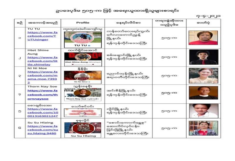 နိုင်ငံတော်၏ အုပ်ချုပ်မှုယန္တရားပျက်ပြားစေရန်ရည်ရွက်ချက်ဖြင့် နိုင်ငံ့ဝန်ထမ်းများအား CDM လှုပ်ရှားမှုတွင် ပါဝင်စေရန်လှုံ့ဆော်ခြင်း၊ CRPH မတရားအသင်းအား ထောက်ခံသည့် အကြောင်းအရာများ၊ မမှန်သတင်းများအား ဖြန့်ဝေခြင်း၊ နိုင်ငံတော်တည်ငြိမ်အေးချမ်းမှုကို ပျက်ပြားစေပြီး ဆူပူအုံကြွမှုဖြစ်ပေါ်စေရန်နှင့် အများပြည်သူ အထိတ်တလန့်ဖြစ်စေရန် အတွက် သွေးထိုးလှုံ့ဆော်မှုများ ပြုလုပ်ခြင်း၊ Social Punishment ပြုလုပ်ခြင်းများကို လူမှုကွန်ရက် စာမျက်နှာများတွင် ရည်ရွယ်ချက်ရှိရှိ ဖြင့်ဖော်ပြခြင်းနှင့် ဖြန့်ဝေခြင်းများ ဆောင်ရွက် လျက်ရှိသည့် အောက်ဖော်ပြပါ အနုပညာရှင်အချို့နှင့် အခြားပါဝင်ပတ်သက်သူများအား ရာဇသတ်ကြီးပုဒ်မ ၅၀၅-က ဖြင့် အမှုဖွင့်အရေးယူ ဆောင်ရွက်လျက်ရှိသည်။