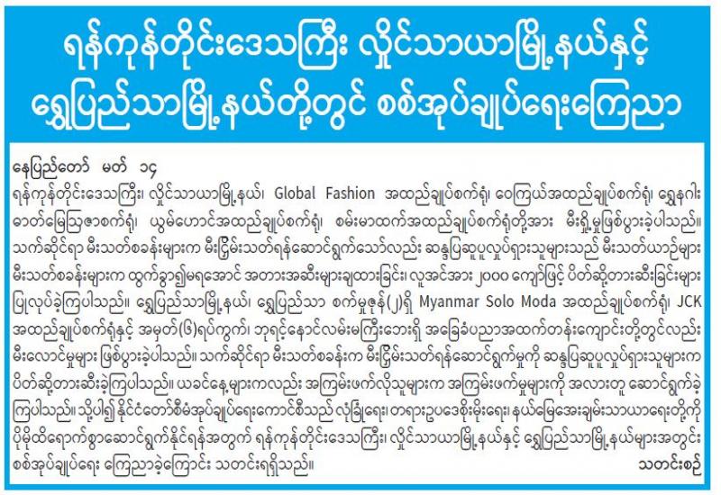 သယံဇာတနှင့် သဘာဝပတ်ဝန်းကျင် ထိန်းသိမ်းရေးဝန်ကြီးဌာန၏ ကြီးကြပ်မှုဖြင့် မြန်မာ့ ကျောက်မျက်ရတနာ ပြပွဲဗဟိုကော်မတီသည် ၂၀၂၁ ခုနှစ်၊ ပုလဲအတွဲများနှင့် ကျောက်မျက် ရတနာများ မြန်မာကျပ်ငွေဖြင့် ရောင်းချပွဲကို နေပြည်တော်၊ မဏိရတနာကျောက်စိမ်းခန်းမတွင် ဧပြီ ၁ ရက် မှ ၁၀ ရက်အထိ ကျင်းပမည်ဖြစ်ကြောင်း သိရသည်။