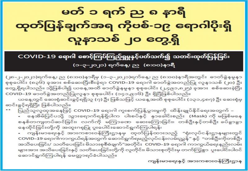 (၁-၃-၂၀၂၁)ရက်နေ့၊ ည (၈:၀၀)နာရီမှ (၂-၃-၂၀၂၁)ရက်နေ့၊ ည (၈:၀၀)နာရီအတွင်း ဓာတ်ခွဲ နမူနာစုစုပေါင်း (၁,၆၅၆) ခုအား စစ်ဆေးပြီးစီးခဲ့ရာ COVID-19 ရောဂါဓာတ်ခွဲအတည်ပြု လူနာသစ် (၄၉) ဦး တွေ့ရှိရပါသည်။ သို့ဖြစ်ပါ၍ ယနေ့အထိ ဓာတ်ခွဲနမူနာ စုစုပေါင်း (၂,၄၉၃,၄၈၁) ခုအား စစ်ဆေးခဲ့ပြီး COVID-19 ဓာတ်ခွဲ အတည်ပြု လူနာ စုစုပေါင်း (၁၄၁,၉၆၅) ဦး ရှိပြီ ဖြစ်ပါသည်။