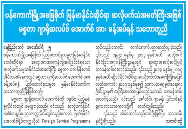 ထိုင်းနိုင်ငံဝန်ကြီးချုပ် ဗိုလ်ချုပ်ကြီး ပရာယုဒ် ချန်အိုချာ (ငြိမ်း)၏ ဖိတ်ကြားချက်အရ နိုင်ငံခြား ရေးဝန်ကြီးဌာန၊ ပြည်ထောင်စုဝန်ကြီး ဦးဝဏ္ဏမောင်လွင်သည် ထိုင်းနိုင်ငံသို့ ယနေ့ နံနက်ပိုင်းတွင် အထူးလေယာဉ်ဖြင့် သွားရောက် ခဲ့ပြီး ညနေပိုင်းတွင် နေပြည်တော်သို့ ပြန် လည်ရောက်ရှိသည်။