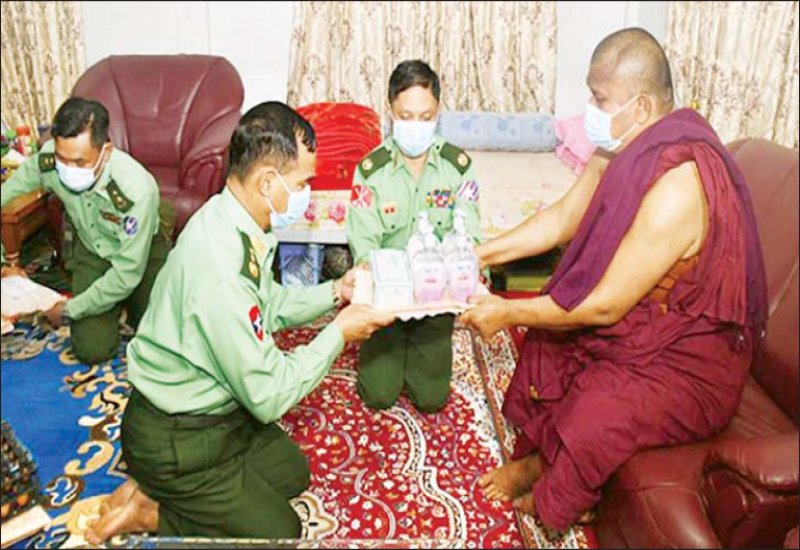 COVID-19 ကူးစက်ရောဂါ ကာကွယ် ထိန်းချုပ်ရေး ကာလတွင် ဘုန်းတော်ကြီးကျောင်းများနှင့် သီလရှင်ကျောင်းများတွင် ဆွမ်းကိစ္စများ အဆင်ပြေစေရန် အတွက် တိုင်းစစ်ဌာနချုပ်များ အလိုက် လှူဒါန်းလျက်ရှိရာ ယနေ့ နံနက်ပိုင်းတွင် ကာကွယ်ရေးဦးစီးချုပ်ရုံး (ကြည်း)မှ ဒုတိယ ဗိုလ်ချုပ်ကြီး အောင်စိုးသည် အရှေ့တောင်တိုင်း စစ်ဌာနချုပ် ရေးတပ်နယ်မှ တာဝန်ရှိ သူများနှင့်အတူ မွန်ပြည်နယ်၊ ရေးမြို့၊ ပုဇ္ဇရာမကျောင်းတိုက် ဆရာတော် ဘဒ္ဒန္တပုဗ္ဗရမ္မ အမှူး ပြုသော သံဃာတော်များအား ဖူးမြော်ကြည်ညိုပြီး ဆရာတော်ထံမှ ငါးပါးသီလခံယူ ဆောက် တည်ကြသည်။ ထို့နောက် သာသနာရေးဆိုင်ရာများ လျှောက်ထားကာ ဆွမ်းဆန်တော်၊ ဆီနှင့် လှူဖွယ် ပစ္စည်းများ ဆက်ကပ်လှူဒါန်းကြသည်။
