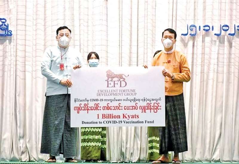 ဦးစိုင်းမျိုးဝင်း(EFD Group) မှ ကိုဗစ်- ၁၉ ကာကွယ်ဆေး ဝယ်ယူရန်အတွက် ကျပ်သိန်းပေါင်း ၁၀၀၀၀ ကို ဇန်နဝါရီ ၂၅ ရက်က ရန်ကုန်မြို့ ဒဂုံမြို့နယ်ရှိ ရန်ကုန်တိုင်းဒေသကြီး အစိုးရအဖွဲ့ရုံး ၌ လှူဒါန်းရာ ရန်ကုန်တိုင်းဒေသကြီး ဝန်ကြီးချုပ် ဦးဖြိုးမင်းသိန်းက လက်ခံသည်။
