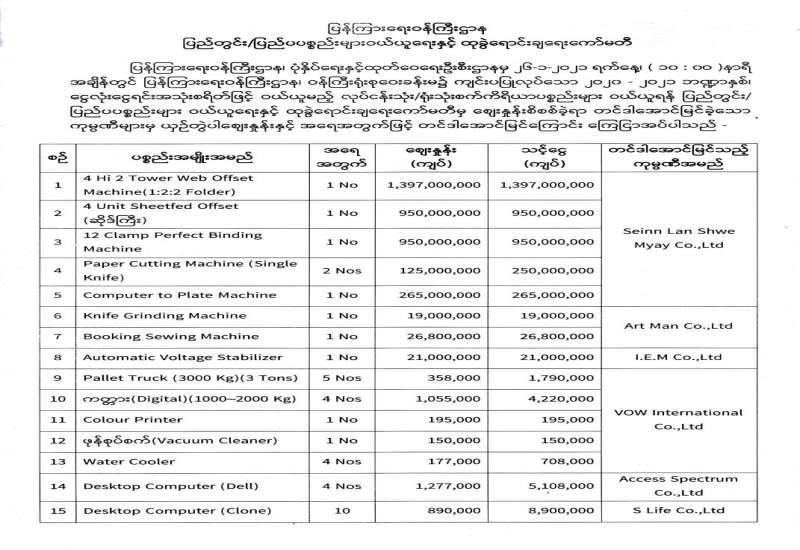 ပြန်ကြားရေးဝန်ကြီးဌာန၊ ပုံနှိပ်ရေးနှင့်ထုတ်ဝေရေးဦးစီးဌာနမှ ၂၆-၁-၂ဝ၂၁ ရက်နေ့၊ ( ၁၀ : ၀ဝ) နာရီ အချိန်တွင် ပြန်ကြားရေးဝန်ကြီးဌာန၊ ဝန်ကြီးရုံးစုဝေးခန်းမ၌ ကျင်းပပြုလုပ်သော ၂ဝ၂၀ - ၂ဝ၂၁ ဘဏ္ဍာနှစ်၊ ငွေလုံးငွေရင်းအသုံးစရိတ်ဖြင့် ဝယ်ယူမည့် လုပ်ငန်းသုံး/ရုံးသုံး စက်ကိရိယာ ပစ္စည်းများ ဝယ်ယူရန် ပြည်တွင်း/ ပြည်ပပစ္စည်းများ ဝယ်ယူရေးနှင့် ထုခွဲရောင်းချရေး ကော်မတီမှ စျေးနှုန်းစိစစ်ခဲ့ရာ တင်ဒါအောင်မြင်ခဲ့သော ကုမ္ပဏီများမှ ယှဉ်တွဲပါစျေးနှုန်းနှင့် အရေအတွက်ဖြင့် တင်ဒါအောင်မြင်ကြောင်း ကြေငြာအပ်ပါသည် -