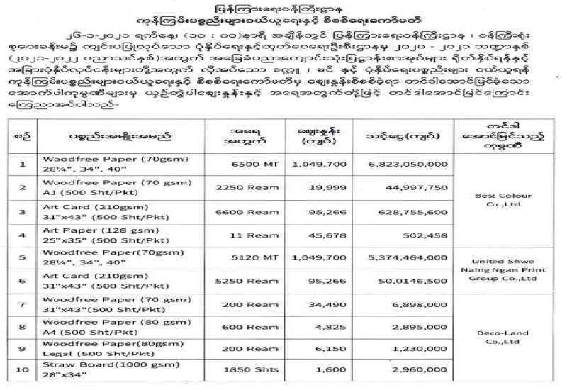 ၂၆-၁-၂ဝ၂၁ ရက်နေ့၊ (၁၀ : ၀ဝ)နာရီ အချိန်တွင် ပြန်ကြားရေးဝန်ကြီးဌာန ၊ ဝန်ကြီးရုံး စုဝေးခန်းမ၌ ကျင်းပပြုလုပ်သော ပုံနှိပ်ရေးနှင့်ထုတ်ဝေရေးဦးစီးဌာနမှ ၂၀၂၀ - ၂၀၂၁ ဘဏ္ဍာနှစ် (၂၀၂၁-၂၀၂၂ ပညာသင်နှစ်)အတွက် အခြေခံပညာကျောင်းသုံးပြဋ္ဌာန်းစာအုပ်များ ရိုက်နှိပ်ရန်နှင့် အခြားပုံနှိပ်လုပ်ငန်းများတို့အတွက်