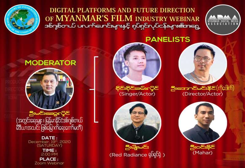 ပြန်ကြားရေးဝန်ကြီးဌာနနှင့် မြန်မာနိုင်ငံ ဒီဂျစ်တယ် မီဒီယာအသင်း ဖြစ်မြောက်ရေး ကော်မတီ တို့ ပူးပေါင်း ကျင်းပသည့် “ဒီဂျစ်တယ်ပလက်ဖောင်းများနှင့် မြန်မာ့ရုပ်ရှင် လုပ်ငန်းများ၏ အရွေ့” အွန်လိုင်းဆွေးနွေးပွဲကို ဒီဇင်ဘာလ ၁၉ ရက်နေ့ မွန်းလွဲ ၂ နာရီတွင် Zoom Webinar စနစ်ဖြင့် ကျင်းပပြုလုပ် သွားမည်ဖြစ်ကြောင်း သိရသည်။