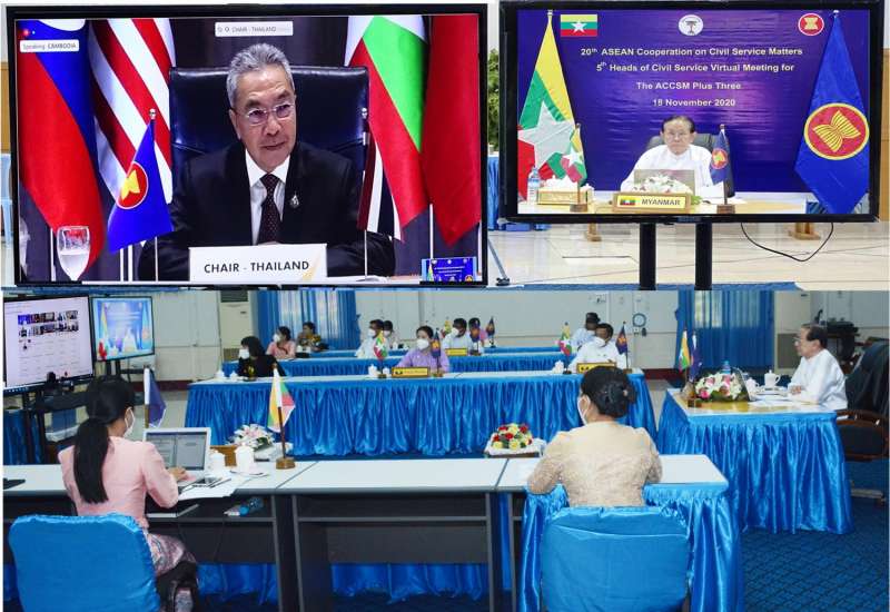 အာဆီယံ နိုင်ငံ့ဝန်ထမ်းဆိုင်ရာ ပူးပေါင်းဆောင်ရွက်ရေးကဏ္ဍ (ASEAN Cooperation on Civil Service Matters-ACCSM) ၏ (၂၀၁၉-၂၀၂၀) အလှည့်ကျ ဥက္ကဋ္ဌအဖြစ် တာဝန်ယူ ဆောင်ရွက်လျက်ရှိသည့် ထိုင်းနိုင်ငံ နိုင်ငံ့ဝန်ထမ်းကော်မရှင်ရုံးက ဦးဆောင်၍ ဗွီဒီယိုကွန်ဖရင့် စနစ်ဖြင့် အကြိမ်(၂၀)မြောက် အာဆီယံ နိုင်ငံ့ဝန်ထမ်း အဖွဲ့အစည်းအကြီးအကဲများ အစည်း အဝေးနှင့် (၅)ကြိမ်မြောက် အာဆီယံ+၃ နိုင်ငံ့ဝန်ထမ်း အဖွဲ့အစည်းအကြီးအကဲများ အစည်း အဝေးများကို ယနေ့တွင် ကျင်းပသည်။