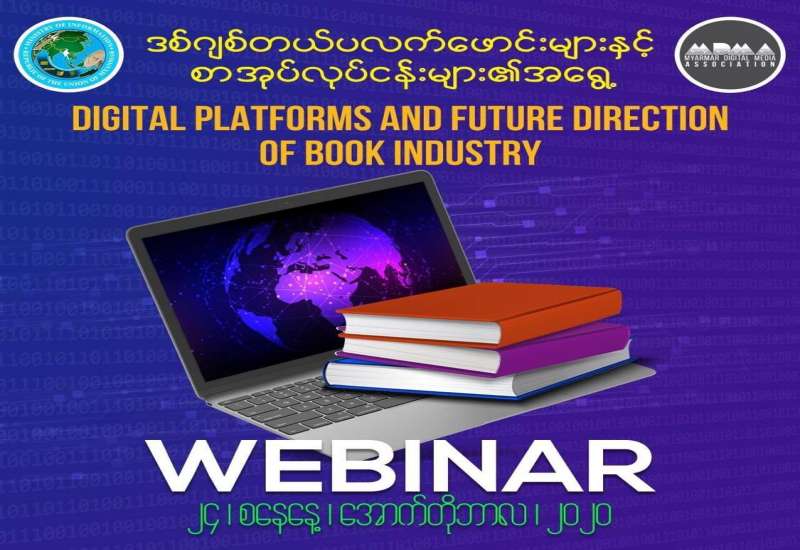 မြန်မာနိုင်ငံ ဒီဂျစ်တယ်မီဒီယာအသင်းဖြစ်မြောက်ရေး ကော်မတီက စီစဉ်ကျင်းပမည့် “ဒီဂျစ် တယ်ပလက်ဖောင်းများနှင့် စာအုပ်လုပ်ငန်းများ၏ အရွေ့ (Digital Platforms and Future Direction of Book Industry Webinar)” အွန်လိုင်းဆွေးနွေးပွဲကို ၂၄−၁၀−၂၀၂၀(စနေနေ့) မွန်းလွဲ (၂)နာရီတွင် ကျင်းပမည်ဖြစ်သည်။