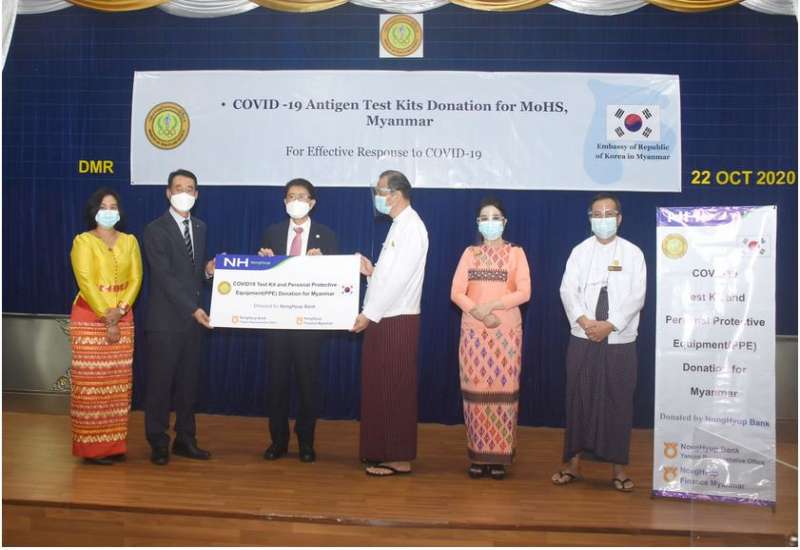 ကျန်းမာရေးနှင့် အားကစားဝန်ကြီးဌာနသို့ ကိုရီးယားသမ္မတနိုင်ငံအခြေစိုက် Shinhan Bank ၊ Shwe Daehan Motors Co., Ltd နှင့် NongHyup Bank and NongHyup Finance Myanmar တို့က Covid-19 Antigen Test Kits များနှင့် PPE များ ပေးအပ်လှူဒါန်းပွဲ အခမ်းအနားကို ယနေ့နံနက် ၁၁ နာရီက ရန်ကုန်မြို့ ဒဂုံမြို့နယ် ဇီဝကလမ်း အမှတ်(၅)ရှိ ဆေးသုတေသနဦးစီးဌာန(ရုံးချုပ်) အစည်းအဝေးခန်းမ၌ ပြုလုပ်သည်။