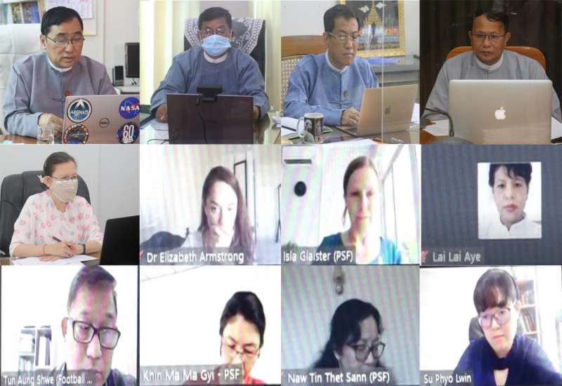 လူမှုသဟဇာတဆိုင်ရာ လုပ်ငန်းများ ဆက်လက်ဆောင်ရွက်နိုင်ရန် လူမှုသဟဇာsတဆိုင် ရာ မူဘောင်တစ်ရပ် ပေါ်ပေါက်လာရေးဆွေးနွေးပွဲကို ယနေ့နံနက်ပိုင်းက လူမှုဝန်ထမ်း ၊ကယ် ဆည်ရေးနှင့် ပြန်လည်နေရာ ချထားရေးဝန်ကြီးဌာန ပြည်ထောင်စုဝန်ကြီးဒေါက်တာဝင်းမြတ် အေးနှင့် ဝန်ကြီးဌာန တာဝန်ရှိ သူများ၊ Paung Sie Facility နှင့် ဩစတြေးလျနိုင်ငံ Football United အဖွဲ့တို့ အွန်လိုင်းစနစ်ဖြင့်ကျင်းပပြုလုပ်သည်။