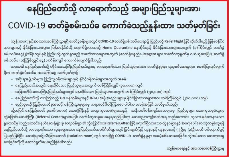 နေပြည်တော် လာရောက်သည့် ပြည်သူ့များအား Covid-19 ဓာတ်ခွဲစမ်းသပ်ခ ကောက်ခံ သည့်နှုန်းထား သတ်မှတ်ခြင်း