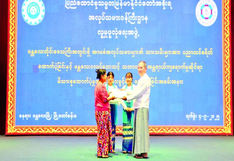မန္တလေးတိုင်းဒေသကြီးအတွင်းရှိ အာမခံအလုပ်သမားများ၏ သားသမီးများအား ပညာသင်စရိတ်ထောက်ပံ့ခြင်းနှင့် မန္တလေးငလျင်ဘေးသင့် သဘာဝဘေးအန္တရာယ် ကျရောက်မှုဆိုင်ရာ မိသားစုထောက်ပံ့မှု အကျိုးခံစားခွင့်များပေးအပ်ခြင်း အခမ်းအနားကို ယနေ့နံနက်ပိုင်းက မန္တလေးမြို့ မြို့တော်ခန်းမ၌ကျင်းပရာ အလုပ်သမားဝန်ကြီးဌာန ပြည်ထောင်စုဝန်ကြီး ဦးအောင်ကျော်ဟိုး၊ တိုင်းဒေသကြီးဝန်ကြီးများ၊ ဌာနဆိုင်ရာတာဝန်ရှိသူများ၊ အရာထမ်း၊ အမှုထမ်းများ၊ အလုပ်ရှင်၊ အလုပ်သမားကိုယ်စားလှယ်များ တက်ရောက်ကြသည်။