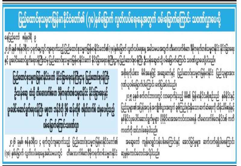 ယနေ့ဇန်နဝါရီလ ၁၀ ရက်နေ့တွင် ကျရောက်သော ကချင်ပြည်နယ်၏ (၇၈)နှစ်မြောက် ထူးမြတ်သည့်မင်္ဂလာ အခါသမယတွင် ပြည်နယ်သူ၊ ပြည်နယ်သားများအားလုံးနဲ့ ကချင်တိုင်းရင်းသားအားလုံး စိတ္တသုခ၊ ကာယသုခနှစ်ဖြာ သောသုခနှင့်ပြည့်စုံလျက် ကျန်းမာချမ်းသာပြီး ကောင်းကျိုးလိုရာဆန္ဒ ပြည့်စုံပါစေကြောင်း ဆုမွန်ကောင်းတောင်းလျက် နှုတ်ခွန်းဆက်သအပ်ပါသည်။